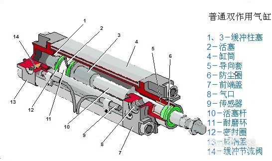 以氣動系統(tǒng)中常使用的單活塞桿雙作用氣缸為例來說明,氣缸典型結(jié)構(gòu)如下圖所示。它由缸筒、活塞、活塞桿、前端蓋、后端蓋及密封件等組成。雙作用氣缸內(nèi)部被活塞分成兩個腔。有活塞桿腔稱為有桿腔,無活塞桿腔稱為無桿腔。